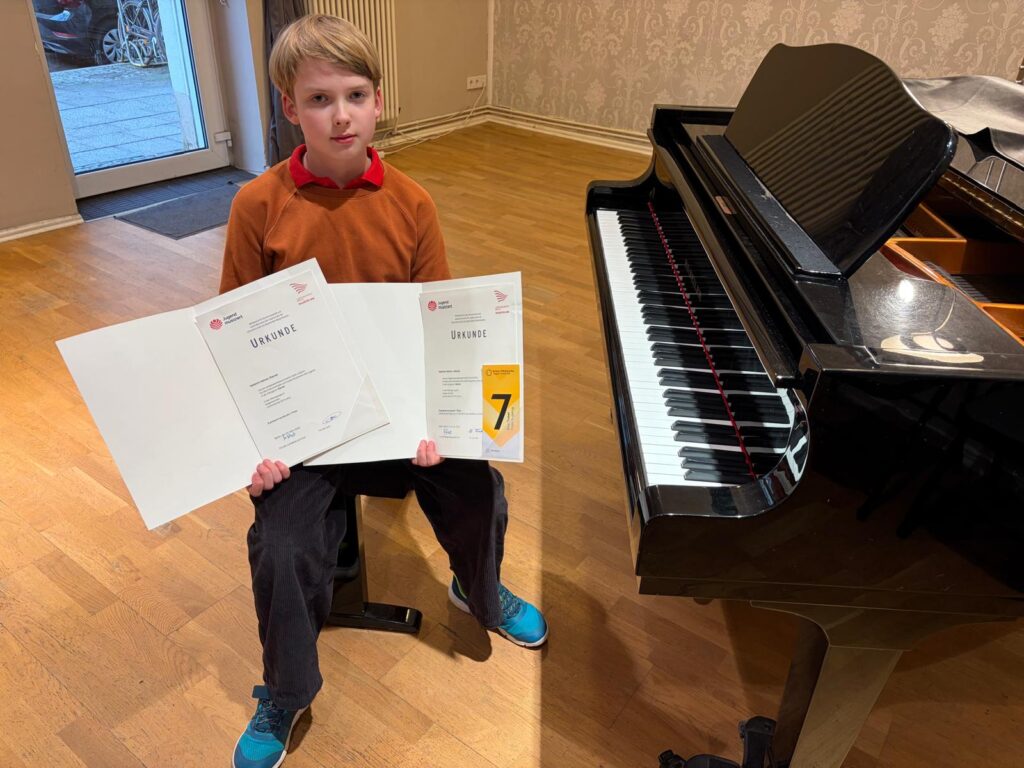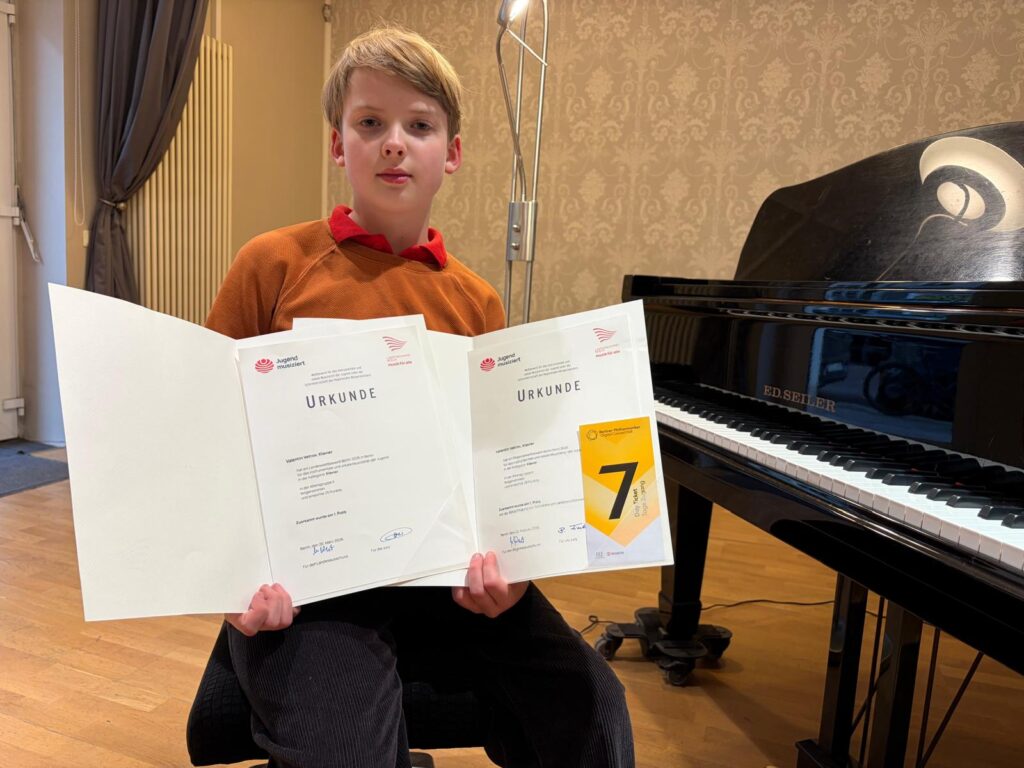 Hallo liebe Schüler, liebe Eltern, liebe Schulgemeinschaft, mit großer Freude können wir mitteilen, dass unser Schüler Valentin Vetrov im Fach Klavier, aus der Klasse von Frau Natascha Osterkorn, beim Landeswettbewerb „Jugend musiziert“ in Berlin erfolgreich teilgenommen hat. Er wurde mit einem 1. Preis ausgezeichnet. Besonders hervorzuheben ist, dass er von der Jury die volle Punktzahl erreicht hat – 25 von 25 Punkten. Wir sind sehr stolz auf diese hervorragende Leistung und gratulieren ganz herzlich! Ihr Team Salon Dreiklang.